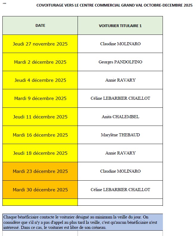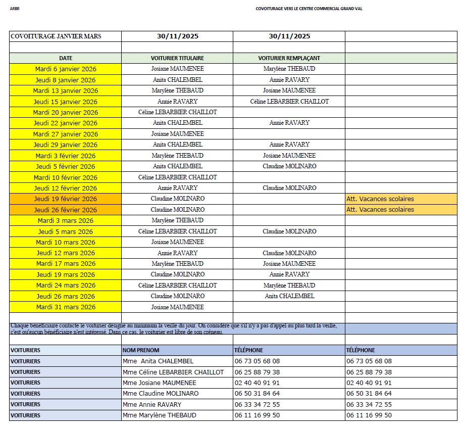 Des bénévoles de l’ARBR (les « Voituriers ») se proposent d’amener toute personne sans voiture mais autonome à Grand Val (le mardi ou le jeudi matin) pour qu’ils puissent faire leurs courses (selon planning sur le site de l’ARBR).